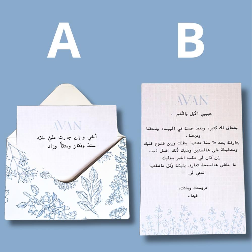 وهو الطريقة المثلى لإيصال مشاعرك وأفكارك بلمسة من الأناقة والتميّز. مصنوع من أجود أنواع الورق، ليضفي على رسالتك طابعاً خاصاً وفريداً.